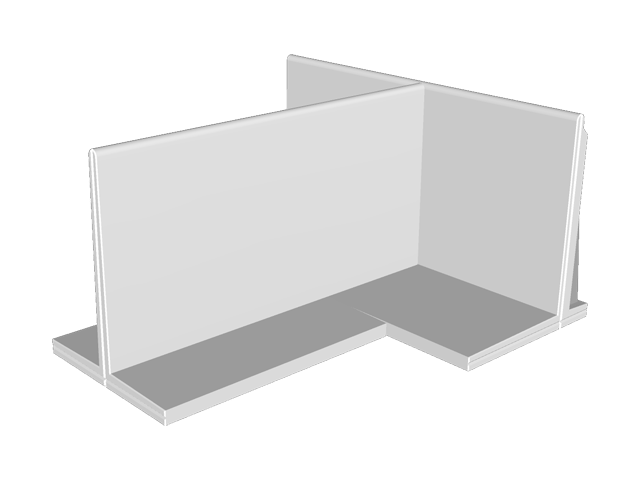 Die VBHTXX sind Stützwände, die gegen die VBLXX- und VBTXX-Stützwände angebracht werden können. Die Wände sind doppelseitig belastbar. Die T-Wand wird aus einem Teil gefertigt und bildet mit einer VBLXX an zwei Seiten eine Innenecke von 90°.