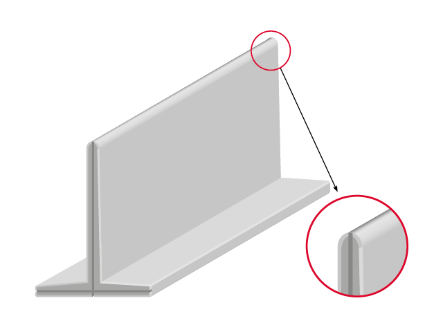 Sowohl die senkrechte Wand als auch die Bodenplatte verfügen über eine Nut zum Anbringen der Dichtungen, um eine vollkommene Abdichtung zu garantieren. Die horizontale V-Nut im Fuß von 15 x 15 mm ist zum Auftragen der Quellpaste vorgesehen. Die vertikale V-Nut in der Wand kann mit einer Kunststofflatte ausgestattet werden. Die abgerundete Oberseite verhindert das Abreißen der eventuellen Abdeckung.